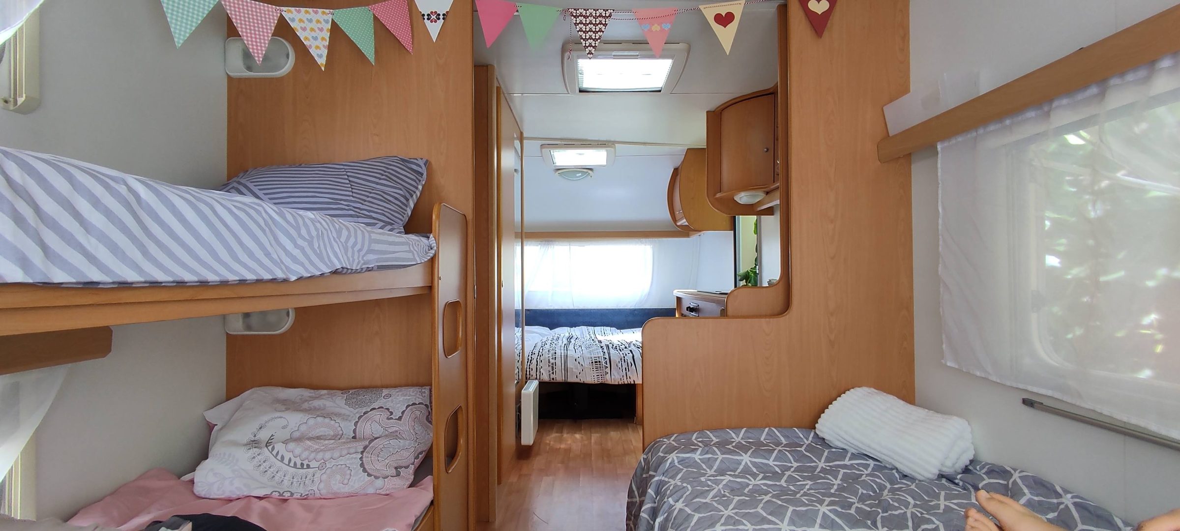 Clothing was the first battle. Five people, all seasons, all occasions, some level of dignity — and it all had to fit into spaces roughly the size of overhead lockers on a plane. The solution? Frequent, very regular visits to public laundromats, which honestly became one of the unexpected social rituals of our caravan life. One set of bed linen each. One towel each. That's it.