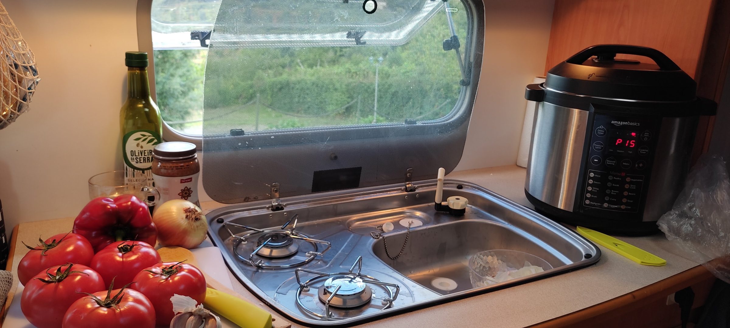 By evening, the young Dutch couple camping next to us had become friendly in that easy, natural way that happens between caravan travelers — you're neighbors, you share a space, conversations start over nothing. I cooked for all of us: Shakshuka, homemade hummus and a fresh salad. We ate outside as it got dark, easy conversation across the camping table, strangers who felt briefly like old friends.